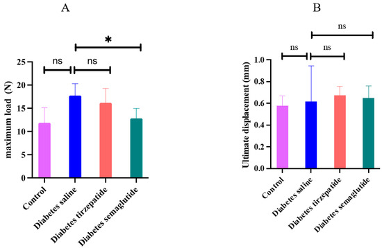 Maximum load and ultimate displacement determined by the load displacement curve. All data are presented as means ± SD. *: Compared to saline-treated diabetic mice, p < 0.05; ns, non-significant. (A) maximum load; (B) ultimate displacement.