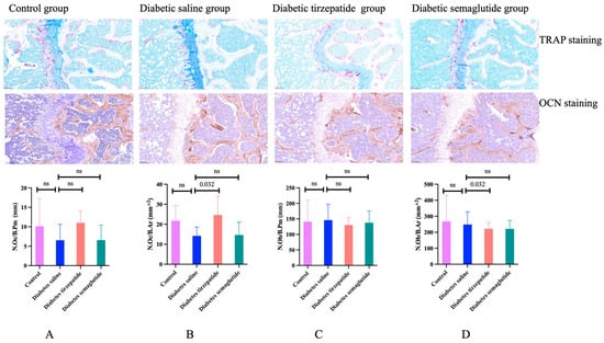 TRAP staining and OCN staining were implemented to determine the osteoclast and osteoblast number per bone perimeter or per bone area. Compared to saline-treated diabetic mice, the tirzepatide treatment group showed a higher osteoclast number per bone area and lower osteoblast number per bone area. However, no other significance was found (Figure 5).