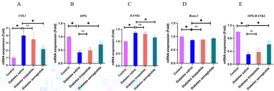 Results of real-time quantitative polymerase chain reaction. All data are presented as means ± SD. *: Compared to saline-treated diabetic mice, p < 0.05; ns, non-significant. (A) Col1 mRNA; (B) OPG mRNA; (C) RANKL mRNA; (D) RUNX2 mRNA; (E) OPG/RANKL.