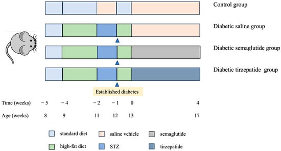The diabetic mice were then randomly separated into three groups (n = 10/group) and were subcutaneously injected with either saline, semaglutide, or tirzepatide for 4 weeks until week 17: group 1—diabetic mice with saline vehicle (0.9% NaCl, sc., once-daily); group 2—diabetic mice with semaglutide (40 μg/kg, subcutaneous, every three days); group 3—diabetic mice with tirzepatide (10 nmol/kg, subcutaneous, once-daily). Normal control mice were injected with the saline vehicle (Figure 7). These doses of semaglutide and tirzepatide were based on previous studies [26,27]. The period of 4 weeks was previously shown to induce significant improvement in tissue material properties [28].