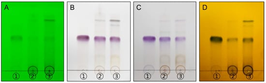 TLC chromatograms of each sample compound and the references: (A) UV 254 nm, (B) 10% H2SO4, (C) ρ-anisaldehyde H2SO4, and (D) FeCl3. The eluent system employed was chloroform/methanol/water = 70:30:4 (v/v/v). ① Oregonin, ② Alnus japonica ethanol extract (AJE), and ③ Alnus japonica hot water extract (AJHW).