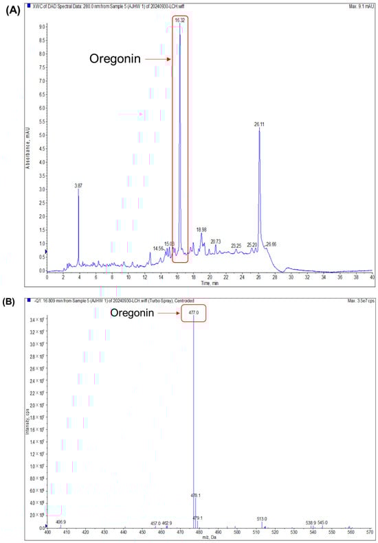 Negative mode LC-MS/MS analysis of oregonin (1000 μg/mL). (A) Extracted ion chromatogram of oregonin and (B) product ion mass spectrum of oregonin.