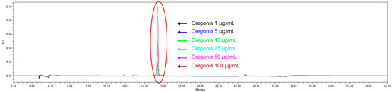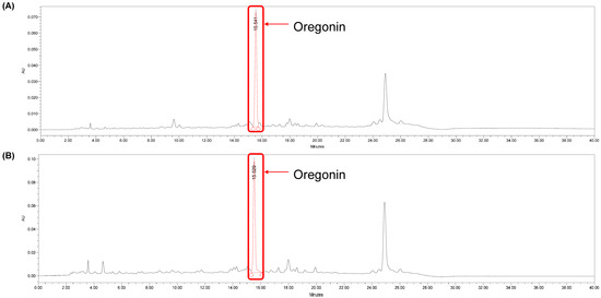 Using the least-squares method, a relationship between concentration and peak area was established (R2 value). From six concentrations of oregonin, a standard calibration curve and curve equation were derived, yielding Y = 8139.8x − 7014.6 (R2 = 0.9997) increments of oregonin (Figure 3). The calibration curve exhibited excellent linearity (correlation coefficient 0.9997). The retention time of oregonin was 15.47 ± 0.01 min (Figure 4), and the average content of the oregonin was calculated as 38.62 ± 0.3 μg/mL (n = 3) in AJE and 53.52 ± 0.21 μg/mL (n = 3) in AJHW using this formula (Figure 5).