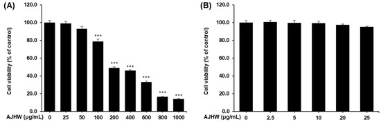 Cytotoxicity of Alnus japonica hot water extract (AJHW) on C2C12 myoblasts. (A) Treatment concentrations: 0, 25, 50, 100, 200, 400, 600, 800, and 1000 μg/mL. (B) Treatment concentrations: 0, 2.5, 5, 10, 20, and 25 μg/mL. Cell viability was calculated as described in Section 4. Values are expressed as the mean ± S.E.M. (n = 5). *** p < 0.001 significantly different from that of the 0 μg/mL group.