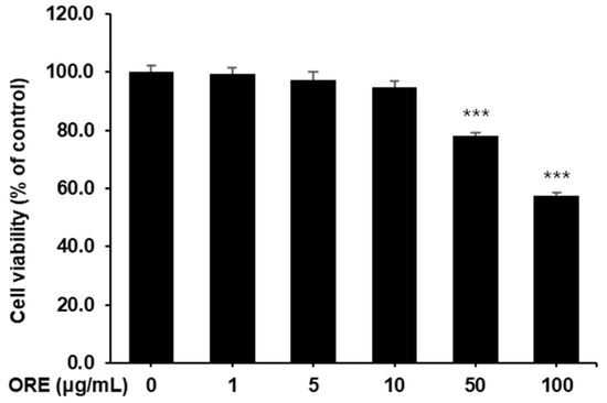 Cytotoxicity of oregonin (ORE) on C2C12 myoblasts. Cell viability was calculated as outlined in the Section 4. Values are expressed as the mean ± S.E.M. (n = 4). *** p < 0.001 indicating a significant difference from the 0 μg/mL group.