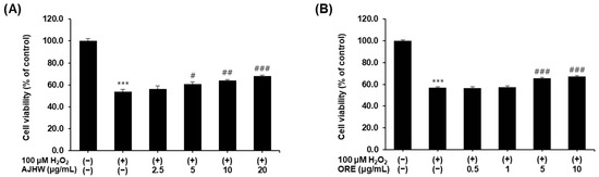 Protective effect of (A) Alnus japonica hot water extract (AJHW) and (B) oregonin (ORE) on cell viability in H2O2-treated C2C12 myoblasts. Values are expressed as the mean ± S.E.M. (n = 4). *** p < 0.001 significantly different from that of [H2O2 (−)/AJHW (−)] and [H2O2 (−)/ORE (−)] group. # p < 0.05, ## p < 0.01, ### p < 0.001 significantly different from that of the [H2O2 (+)/AJHW (−)] and [H2O2 (+)/ORE (−)] group.