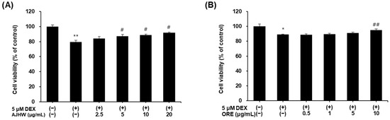Protective effect of (A) Alnus japonica hot water extract (AJHW) and (B) oregonin (ORE) on cell viability in DEX-treated C2C12 myotubes. Values are expressed as the mean ± S.E.M. (n = 4). * p < 0.05, ** p < 0.01 significantly different from that of [DEX (−)/AJHW (−)], [DEX (−)/ORE (−)] group. # p < 0.05, ## p < 0.01 significantly different from that of [DEX (+)/AJHW (−)], [DEX (+)/ORE (−)] group.