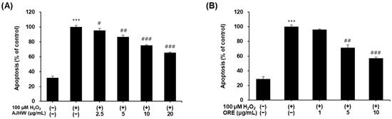 Protective effect of (A) Alnus japonica hot water extract (AJHW) and (B) oregonin (ORE) on apoptosis in H2O2-treated C2C12 myoblasts. Values are expressed as the mean ± S.E.M. (n = 4). *** p < 0.001 significantly different from that of [H2O2 (−)/AJHW (−)], [H2O2 (−)/ORE (−)] group. # p < 0.05, ## p < 0.01, ### p < 0.001 significantly different from those of the [H2O2 (+)/AJHW (−)] and [H2O2 (+)/ORE (−)] groups.
