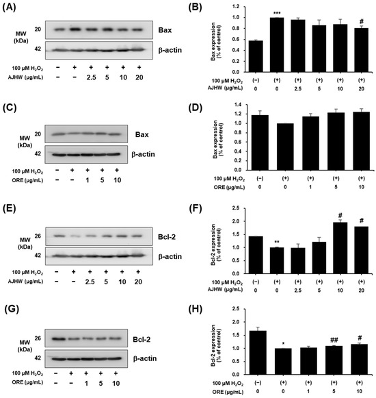 Anti-apoptotic effects of Alnus japonica hot water extract (AJHW) and oregonin (ORE) on H2O2-induced oxidative damage in C2C12 myoblasts. Western blotting was used to analyze the levels of (A–D) Bax, (E–H) Bcl-2, and β-actin, as described in Section 4. Values are expressed as the mean ± S.E.M. (n = 3). * p < 0.05, ** p < 0.01, *** p < 0.001 significantly different from that of [H2O2 (−)/AJHW (−)], [H2O2 (−)/ORE (−)] group. # p < 0.05, ## p < 0.01 significantly different from those of the [H2O2 (+)/AJHW (-)] and [H2O2 (+)/ORE (−)] groups.