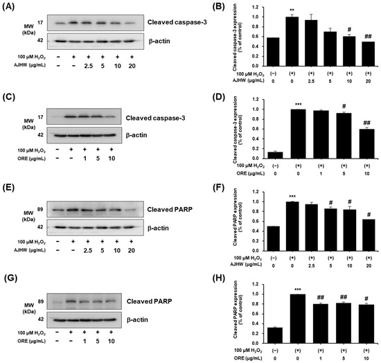 Anti-apoptotic effects of Alnus japonica hot water extract (AJHW) and oregonin (ORE) on H2O2-induced oxidative damage in C2C12. Western blotting was used to analyze the levels of (A–D) cleaved caspase-3, (E–H) cleaved PARP, and β-actin, as outlined in Section 4. Values are expressed as the mean ± S.E.M. (n = 3). ** p < 0.01, *** p < 0.001 significantly different from [H2O2 (−)/AJHW (−)], [H2O2 (−)/ORE (−)] group. # p < 0.05, ## p < 0.01 significantly different from [H2O2 (+)/AJHW (−)] and [H2O2 (+)/ORE (−)] groups.