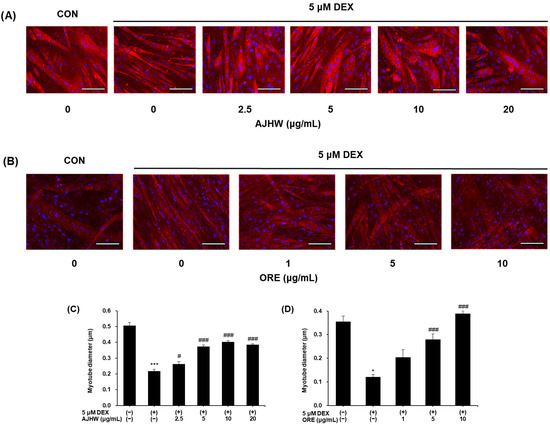 Effects of (A,C) Alnus japonica hot water extract (AJHW) and (B,D) oregonin (ORE) on dexamethasone-induced muscle atrophy in C2C12 myotubes. Values are expressed as the mean ± S.E.M. (n = 5). The scale bar represents 100 μm. * p < 0.05, *** p < 0.001 significantly different from that of [DEX (−)/AJHW (−)], [DEX (−)/ORE (−)] group. # p < 0.05, ### p < 0.001 significantly different from that of [DEX (+)/AJHW (−)], [DEX (+)/ORE (−)] group.