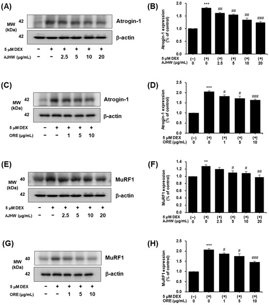 Effect of Alnus japonica hot water extract (AJHW) and oregonin (ORE) on the muscle-degradation-related protein expression levels of (A–D) Atrogin-1, (E–H) MuRF1 in DEX-treated C2C12 myotubes. AJHW and ORE were added to DEX-treated C2C12 myotubes and cultured for 24 h. Protein expression levels were determined using Western blotting. The expression levels were normalized to that of β-actin and expressed relative to those in the CON group. Values are expressed as the mean ± S.E.M. (n = 4). ** p < 0.01, *** p < 0.001 significantly different from [DEX (−)/AJHW (−)], [DEX (−)/ORE (−)] group. # p < 0.05, ## p < 0.01, ### p < 0.001 significantly different from the [DEX (+)/AJHW (−)], [DEX (+)/ORE (−)] group.