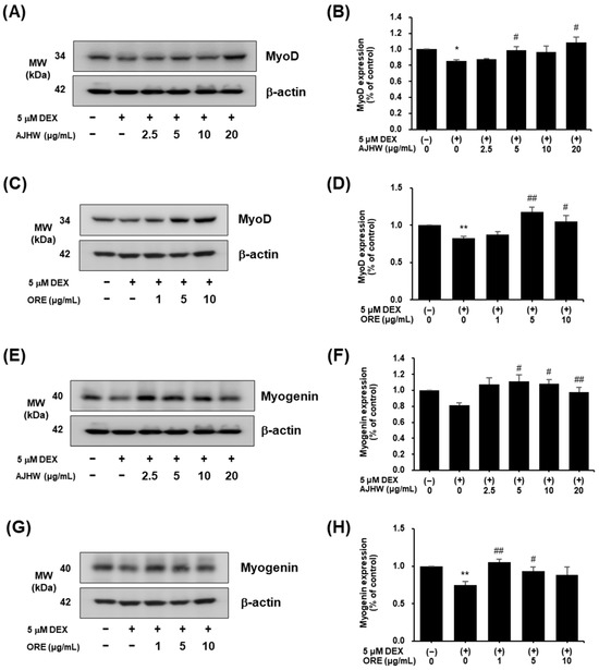 Effect of Alnus japonica hot water extract (AJHW) and oregonin (ORE) on the muscle-synthesis-related protein expression levels of (A–D) MyoD, and (E–H) Myogenin in DEX-treated C2C12 myotubes. AJHW and ORE were added to DEX-treated C2C12 myotubes and cultured for 24 h. Protein expression levels were determined using Western blotting. The protein expression levels were normalized to β-actin and expressed relative to those in the CON group. Values are expressed as the mean ± S.E.M. (n = 4). * p < 0.05, ** p < 0.01 significantly different from that of [DEX (−)/AJHW (−)], [DEX (−)/ORE (−)] group. # p < 0.05, ## p < 0.01 significantly different from the [DEX (+)/AJHW (−)], [DEX (+)/ORE (−)] group.