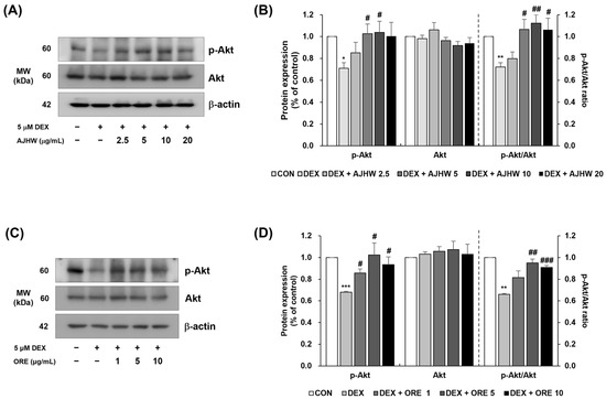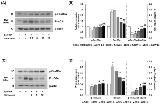 Effect of Alnus japonica hot water extract (AJHW) and oregonin (ORE) on the protein expression levels of (A–D) phospho-FoxO3α and FoxO3α in DEX-treated C2C12 myotubes. AJHW and ORE were separately added to these cells and incubated for 24 h. Protein expression was measured using Western blotting, normalized to β-actin, and reported relative to the CON group. Values are expressed as the mean ± S.E.M. (n = 3). ** p < 0.01, *** p < 0.001 indicating significant differences from the [DEX (−)/AJHW (−)], [DEX (−)/ORE (−)] group. # p < 0.05, ## p < 0.01, ### p < 0.001 indicating significant differences from the [DEX (+)/AJHW (−)], [DEX (+)/ORE (−)] group.