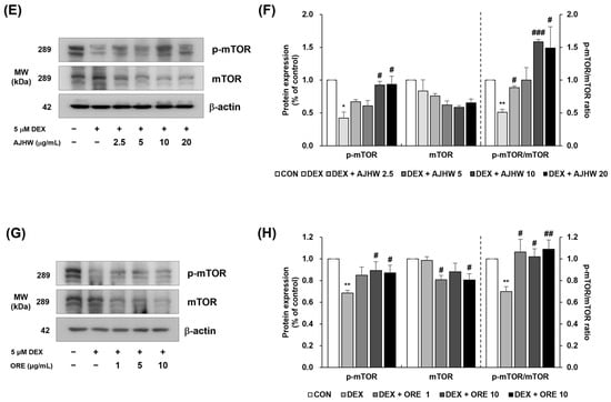 Effect of Alnus japonica hot water extract (AJHW) and oregonin (ORE) on the protein expression levels of (A–D) phospho-Akt and Akt, and (E–H) phospho-mTOR and mTOR in DEX-treated C2C12 myotubes. AJHW and ORE were separately added to these cells and incubated for 24 h. Protein expression was assessed via Western blotting, with β-actin as the normalization standard, and expressed relative to the CON group. Values are reported as the mean ± S.E.M. (n = 3). * p < 0.05, ** p < 0.01, *** p < 0.001, indicating significant differences from the [DEX (−)/AJHW (−)], [DEX (−)/ORE (−)] group. # p < 0.05, ## p < 0.01, ### p < 0.001 indicating significant differences from the [DEX (+)/AJHW (−)], [DEX (+)/ORE (−)] group.