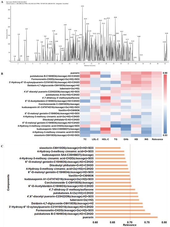 Results of spectrum-effect correlation. (A) Total ions chromatogram of the blood components of P. lobata extract in rats; (B) Heat map of the correlation between the blood components of P. lobata and the serum indicators; (C) The correlation between the components of P. lobata and comprehensive evaluation indicator, the red line indicates a correlation of 0.70.