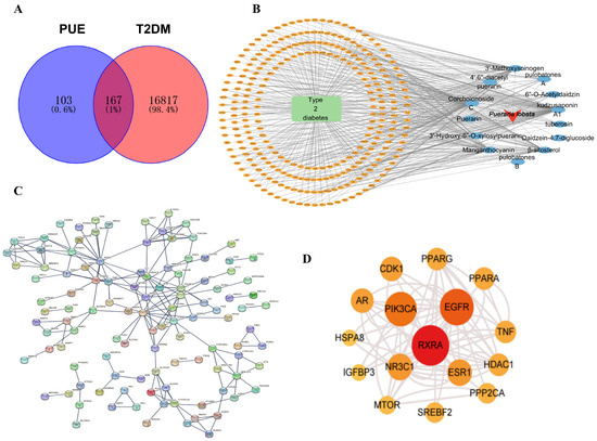 A comprehensive collection of disease targets associated with T2DM was achieved, totaling 16,984 targets sourced from databases, including GeneCards, OMIM, and TTD. According to the results of the previous spectral correlation analysis, chemical information of 12 active ingredients was confirmed through the PubChem database. After the removal of duplicates, 270 disease targets affected by PUE were identified. By overlapping the predicted set of 270 potential targets with the 16,984 T2DM disease gene set, we pinpointed the potential targets of PUE relevant to T2DM treatment, and these target data were verified through the UniProt database. Ultimately, data for 167 PUE targets pertinent to the treatment of T2DM were secured, as illustrated in Figure 2A. Additionally, a direct network illustrating the interactions between active ingredients and targets of PUE was developed using Cytoscape 3.7.2, as depicted in Figure 2B.