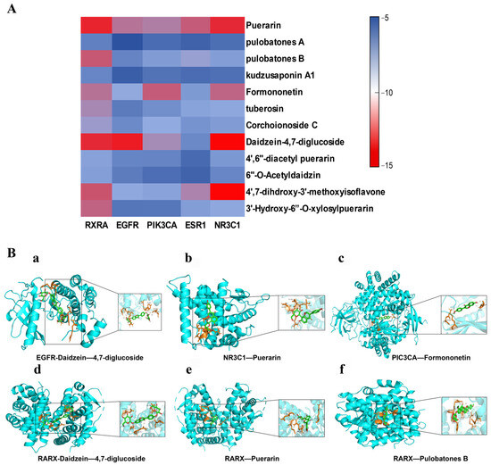 3′-hydroxy-6″-O-xylosylpuerarin, pulobatones A, tuberosin, pulobatones B, puerarin, formononetin, 4′,7-dihdroxy-3′-methoxyisoflavone, Daidzein-4,7-diglucoside, 4′,6″-diacetyl puerarin, 6″-O-Acetyldaidzin, kudzusaponin A1, and corchoionoside C were selected as the potential active components of P. lobata in type 2 diabetes. The core target proteins of P. lobata in type 2 diabetes were screened by network pharmacology. Search PubChem database (https://PubChem.ncbi.nlm.nih.gov/, accessed on 11 January 2022) for CAS numbers of small molecules, download the SDF format of the corresponding compounds, and use Open Babel 3.1.1 to convert to MOL2 format for docking preparation. From the PDB database (https://www.rcsb.org/, accessed on 17 January 2022), the 3D structure of the core protein was obtained by screening for species, conformational resolution, sequence integrity, and pH, and stored as a PDB file for docking. Autodocktools 1.5.7 and Pymol 2.5 were used to dehydrate, hydrogenate and select as the receptor, hydrogenate and select as the ligand, and twist the bonds and centers of the active compounds and the core target proteins. After running AutoGrid and AutoDock, we obtained the docking results of the compounds and proteins, made a heat map, and visualized them using Pymol 2.5 software.