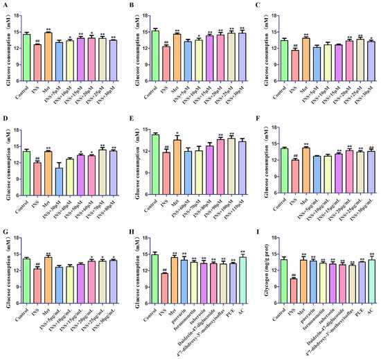 Beneficial effect curve of puerarin (A), formononetin (B), tuberosin (C), Daidzein-4,7-diglucoside (D), 4′,7-dihdroxy-3′-methoxyisoflavone (E), P. lobata extract (F), and active constituent (G); effect of P. lobata on glucose consumption (H) and glycogen levels (I) in IR-HepG2 cells. In comparison to the control group, ## p < 0.01; when contrasted with the model group, * p < 0.05, ** p < 0.01.
