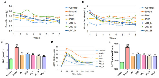 Hypoglycemic effect of P. lobata extract and active constituent on STZ-induced T2DM mice. Food intake (A), water intake (B), FBG levels (C), and OGTT (D,E) of the mice treated with P. lobata extract and active constituent for 10 weeks. In comparison to the control group, ## p < 0.01; when contrasted with the model group, ** p < 0.01.