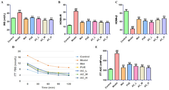 Influence of P. lobata on insulin sensitivity in STZ-induced T2DM mice. (A) Levels of insulin in serum; (B) HOMA-IR values; (C) HOMA-β values; (D) Insulin tolerance test (ITT); (E) AUC for ITT. In comparison to the control group, ## p < 0.01; when contrasted with the model group, ** p < 0.01.