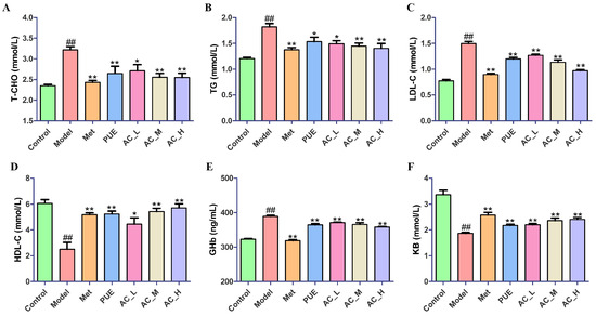 To investigate the impact of diabetes on the serum biochemical indices of P. lobata, we conducted a comprehensive analysis of several key parameters. The levels of total cholesterol (T-CHO), triglycerides (TG), low-density lipoprotein cholesterol (LDL-C), high-density lipoprotein cholesterol (HDL-C), glycated hemoglobin (Ghb), and ketone bodies (KB) in the serum samples collected from mice were measured. As shown in Figure 9, the levels of GHb, LDL-C, T-CHO, and TG were significantly increased (p < 0.01) in the Model compared with Control, while the levels of KB and HDL-C were significantly reduced (p < 0.01). After administration of PUE and AC, the abnormal changes of biochemical indicators were all reversed. The above results suggested that PUE and AC, similar to metformin, can also improve the glycolipid metabolism disorder of T2DM mice. Among them, the AC showed a better effect in some parameters but not all (three of six were significantly different for AC_L).