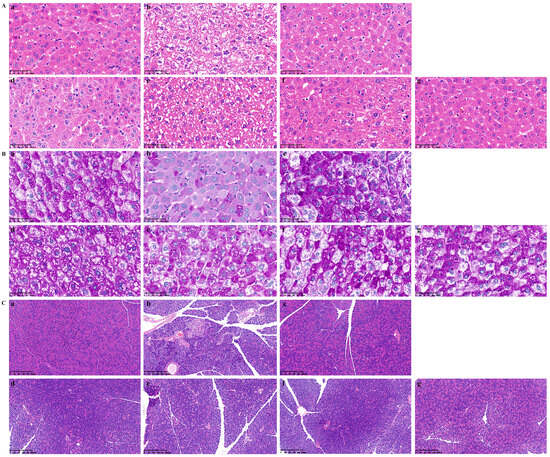 After gathering samples, small pieces of mouse liver tissue and the pancreas were preserved in 4% paraformaldehyde for 24 h, followed by embedding and sectioning [34]. Subsequently, histological changes of the liver were observed by H&E staining and Periodic Acid-Schiff staining (PAS) under a 400× microscope, and the changes of the pancreas were observed by H&E staining under a 100× microscope.