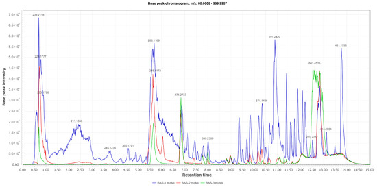 Comparative chromatogram of total ions of crude extracts of the EtOAc phase (EtOAc Control in blue; Mn_EtOAc in red; Co_EtOAc in green) derived from the liquid culture medium of Aspergillus sp.
