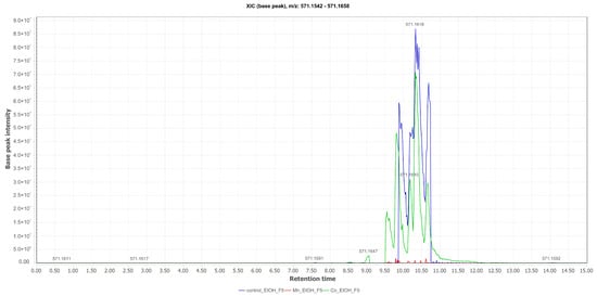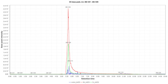 Comparative selected ion chromatograms for pyrophen with m/z 288.1229 (EtOAc Control in blue; Mn_EtOAc in red; Co_EtOAc in green) derived from the liquid culture medium of Aspergillus sp.
