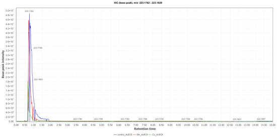 Comparative selected ion chromatograms for nigragillin with m/z 223.1783 (EtOAc Control in blue; Mn_EtOAc in red; Co_EtOAc in green) derived from the liquid culture medium of Aspergillus sp.