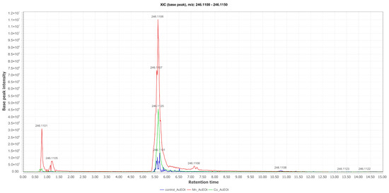 Comparative selected ion chromatograms for penicillquei B with m/z 246.1125 (EtOAc Control in blue; Mn_EtOAc in red; Co_EtOAc in green) derived from the liquid culture medium of Aspergillus sp.