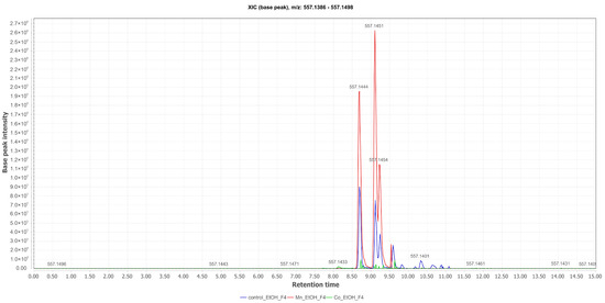 Aurasperone D (4) ([M+H]+ at m/z 557.1451 [M+H]+; Rt = 9.11 min), isolated from the EtOH fractions of the control obtained from the mycelium, had its production enhanced by the presence of MnCl2 in the fungal culture medium. The analysis based on the total ion chromatograms (Figure 5) confirms that the presence of the Mn(II) cation increased the formation of aurasperone D, despite the fact that this substance was not induced, as it also appeared in the control experiment (Figure 6).