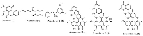 Nigragillin (2) was previously observed in studies with A. awamori in medium supplemented with lychee peel powder [20], while aurasperone D (4) was reported in A. niger cultured in Czapek medium supplemented with ZnSO4 and CuSO4 salt solutions [22]. Penicillquei B (3) was isolated for the first time in rice culture of the genus Penicillium [21].