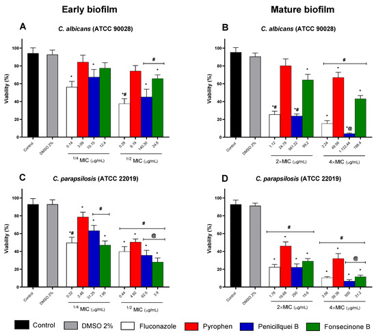 Percentage of inhibition in young (A,C) and mature (B,D) biofilms treated with pyrophen, penicillquei B, and fonsecinone B in strains of C. albicans (ATCC 90028) (A,B) and C. parapsilosis (ATCC 22019) (C,D) assessed by the MTT assay. The control is represented by Candida strains treated with sterile phosphate-buffered saline (PBS), while 2% dimethyl sulfoxide (DMSO) serves as the solubility agent control for the tested chemical isolates and was designated as a treatment. Treatments were based on the values of 1/4 and 1/2 MIC for forming biofilms and 2× and 4× MIC for mature biofilms and compared with untreated controls or the reference antifungal Fluconazole. (*) p < 0.05 compared to control. (#) p < 0.005 compared to the other experimental groups. (@) p < 0.05 compared to the different concentrations.