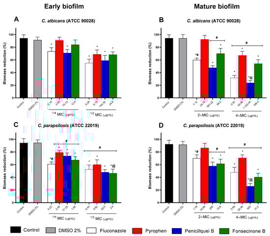 Percentage reduction in biofilm biomass eradication stained with crystal violet for C. albicans (ATCC 90028) (A,C) and C. parapsilosis (ATCC 22019) (B,D). Treatments considered the MIC values (1/4 and 1/2 MIC for forming biofilms and 2× and 4× MIC for mature biofilms) and were compared with untreated controls for each Candida strain that received sterile phosphate-buffered saline (PBS) and with a dimethyl sulfoxide (DMSO) group used as solubility agent for the chemical isolates or the reference antifungal Fluconazole. (*) p < 0.05 compared to control. (#) p < 0.005 compared to other groups. (@) p < 0.05 compared different concentration.