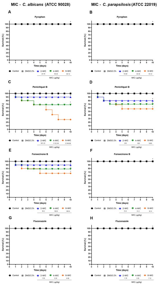 Evaluation of acute toxicity and survival percentage following injection of test substances, pyrophen (A,B), penicillquei B (C,D), Fonsecinone B (E,F), and Fluconazole (G,H). Treatments were based on concentrations of 2×, 4×, and 8× MIC (µg/kg) for C. albicans (ATCC 90028) (A,C,E,G) and C. parapsilosis (ATCC 22019) (B,D,F,H). Controls correspond to Candida strains treated with sterile PBS or with dimethyl sulfoxide (DMSO) (2%) as this solubility agent was used for chemical isolates. Survival was assessed using the log-rank test. (*) p < 0.05 compared to the control group.