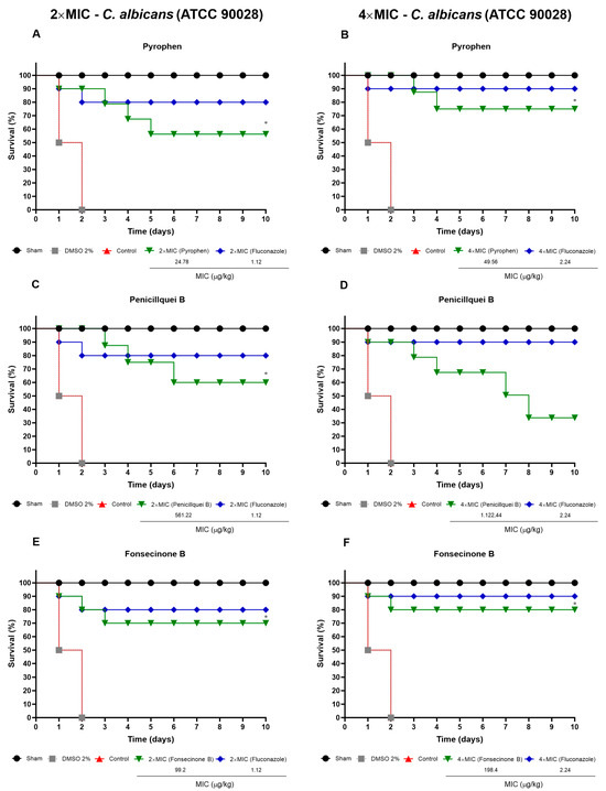 Survival percentage of T. molitor larvae after infection with C. albicans (ATCC 90028) and treatment at concentrations of 2× and 4× MIC (µg/kg) with pyrophen (A,B), penicillquei B (C,D), fonsecinone B (E,F). Negative controls were treated with sterile PBS or with DMSO (2%), and the positive control was Fluconazole. Survival was assessed using the log-rank test. (*) p < 0.05 compared to the control group.