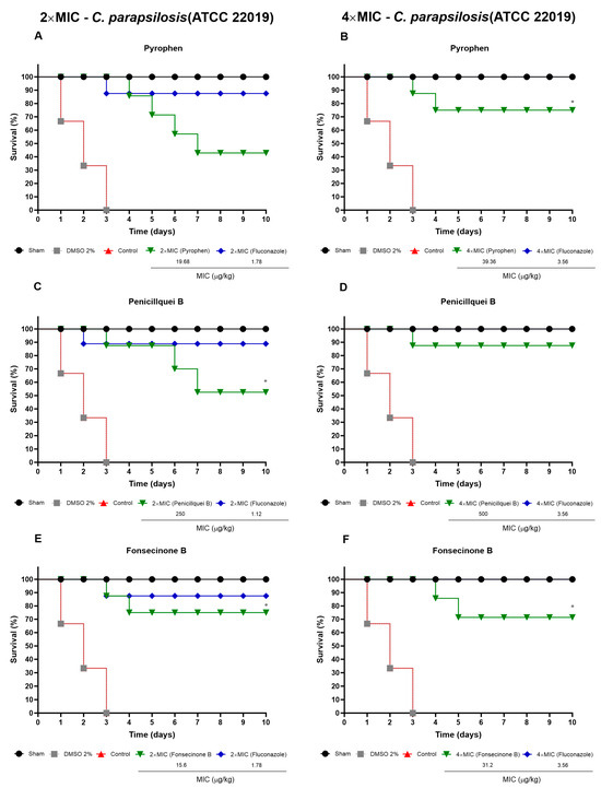 Survival percentage of T. molitor larvae after infection with C. parapsilosis (ATCC 22019) and treatment at concentrations of 2× and 4× MIC (µg/kg) with pyrophen (A,B), penicillquei B (C,D), Fonsecinone B (E,F). Negative controls were treated with sterile PBS or DMSO (2%), and the positive control was Fluconazole. Survival was assessed using the log-rank test. (*) p < 0.05 compared to the control group.