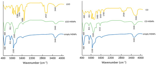 Sattary et al. further investigated the use of MSNs for encapsulating clove oil and lemongrass oil. Citral, known as lemongrass oil, and eugenol, also called clove oil, exhibited clear absorption peaks at 1686 cm−1 and 1430 cm−1, respectively. The bending and stretching vibrations of the Si-O-Si groups were observed at frequencies of 468 cm−1, 811 cm−1, and 1100 cm−1 as shown in Figure 4 [52]. The presence of essential oils from lemongrass (LG) and clove (CV) within MSNs was shown without any harm to the MSN structure. This was confirmed by the detection of characteristic peaks in the spectra of (LG/MSNPs) or (CV/MSNPs).