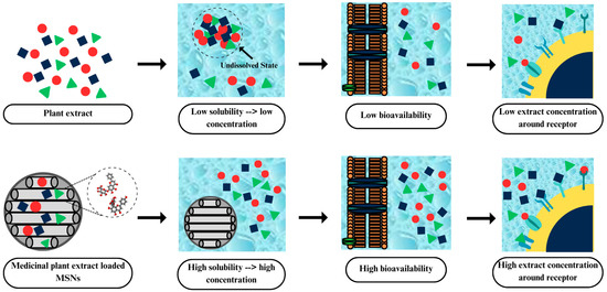 The pharmacological activity of medicinal plant extracts loaded with MSNs is more effective compared to medicinal plant extracts alone due to nanosized particles, as shown in Figure 5. The encapsulation of medicinal plant extracts into MSNs can increase the solubility and stability, facilitating gradual release into the environment and leading to the improvement of bioavailability. Passive diffusion generally achieves drug absorption, where drugs diffuse along the concentration differential from a higher to a lower concentration until equilibrium is reached. Incorporating extract into MSNs allows the soluble extract in the body’s watery parts, such as the interstitial space, to pass through water-filled pores in the endothelium of blood vessels. Therefore, the solubility of extract in the aqueous compartment of the body significantly affects the amount of extract absorption through passive diffusion. The monomolecularly dispersed extract improved solubility and created a supersaturated solution in the body’s aqueous compartment, which increased bioavailability. Improving the bioavailability of extracts could also enhance pharmacokinetics, efficacy, and safety. Therefore, the encapsulated state of the medicinal plant extract has greater pharmacological activity compared to the pure state, resulting in a lower dosage of medicinal plant extract needed [94,95,96].