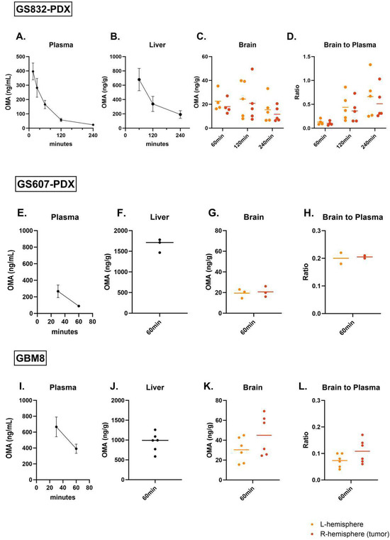 Next, we assessed OMA’s PK profile in two additional glioblastoma PDX models, GS607 and GBM8, ands in naïve non-tumor-bearing mice. Based on the previous findings, we measured the drug concentration in the blood at 30 and 60 min (Figure 1E,I) and tissue samples at 60 min after a single dose of 1.5 mg/kg OMA. Mean plasma concentrations at 60 min were 88 ± 9 ng/mL and 391 ± 58 ng/mL for GS607-PDX and GBM8, respectively. The mean liver drug concentration was 1653 ± 163 ng/g and 998 ± 254 ng/g, for GS607-PDX and GBM8, respectively, while 715.9 ± 4.6 ng/g for naïve mice (Figure 1F,J). In the brain tumor tissue, OMA reached higher mean concentrations in tumor-bearing hemispheres of GBM8 (45 ± 20 ng/g) than in GS607-PDX (21 ± 5 ng/g) or GS832-PDX (18 ± 6 ng/g) models (Figure 1G,K, Table 2). As expected, the lowest drug concentration was measured in the naïve mice (16.4 ± 2.9) (Table 2). The measured brain tumor concentrations corresponded with 82.5 nM, 37.9 nM and 33.0 nM for GBM8, GS607 and GS832, respectively (Supplemental Table S2). Interestingly, despite the established leakiness of the BTB, we did not detect a significant difference in OMA concentrations in the tumor-bearing versus contralateral hemispheres in any of the tested models (Figure 1C,G,K). The B/P ratio of OMA at 60 min post-injection did not vary considerably among the three PDX models; 0.10 for GS832, 0.23 for GS607 and 0.11 for GBM8 (Figure 1D,H,L, Table 2). Overall, these mouse PK data indicate that OMA has brain tumor-penetrating properties reaching higher tumor concentrations than the IC50 values found in vitro in GSCs (Supplemental Table S2).