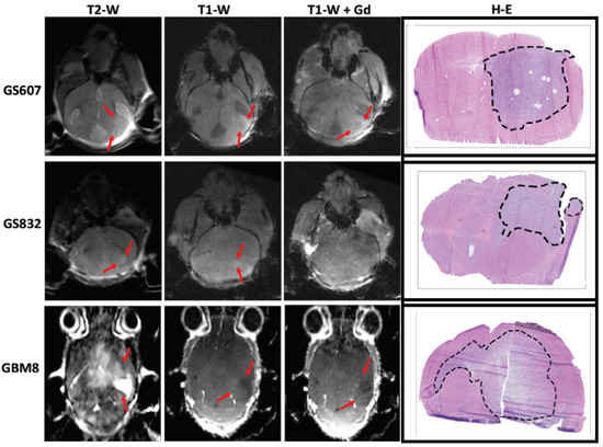 Drug delivery into brain tumor tissue in pharmacologically effective concentrations is a challenging process that is dependent on the vascular integrity of the brain capillaries and the leakiness of the BBB. To gain insight into these properties in the three different PDX model systems, we evaluated both the histology and the extent of the BBB disruption by T1-weighted (TW1) post-gadolinium (Gd) MRI scans (Figure 2 and Supplemental Figure S2). Tumor presence in the mouse brains was confirmed histologically by hematoxylin/eosin (H/E) staining. The GS607-PDX, derived from a mesenchymal subtype of glioblastoma, presents histologically with diffusely infiltrative glial cells, large atypical nuclei and mitosis and signs of microvascular proliferation. Similarly, GS832-PDX, derived from a proneural subtype of glioblastoma, presents with signs of gliosis with hyperchromatic nuclei and mitosis. Lastly, GBM8, the fastest growing and most aggressive of the three models, was previously characterized as a neural subtype with a subfraction of mesenchymal cells [33]. It is characterized by diffuse infiltrative glioma cells and extensive mitosis (Supplemental Figure S3).