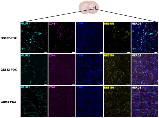 Characterization of the vascular integrity of the glioblastoma PDX models, GS607, GS832 and GBM8. The integrity of the vasculature was assessed by immunofluorescence staining for ZO-1 and GLUT-1, and GSC infiltration by Nestin staining. The number of mice used in this experiment varied between 3 and 6 per model. Scale bar 100 μm.