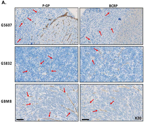 The ATP-binding cassette transporters play a key role in the accumulation of a drug, and high expression of these transporters is linked to the development of multidrug resistance. Therefore, we assessed the expression of the transporter proteins in the tumors of the three PDX models by immunohistochemistry for P-gp (ABCB1) and BCRP (ABCG2). Notably, all three glioblastoma PDX models expressed both P-gp and BCRP transporters on the brain capillaries but not on the glioma cells (Figure 4A).