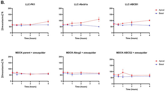 In the MDCK cell lines, zosuquidar was used to inhibit any endogenous activity of canine P-gp. The results in this line suggest that there is no meaningful translocation of the drug between the apical and basolateral compartments of MDCK-ABCG2 or MDCK-Abcg2 cells, indicating that OMA is not a substrate of BCRP (ABCG2/Abcg2) (Figure 4B).