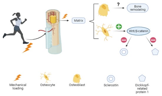 Although “mechanobiology” is a recent interest of researchers and the mechanisms are not yet completely clear, it has been proposed that osteoblasts, the cells that produce bone matrix, translate mechanical loading into biochemical signals that affect bone modeling and remodeling. Osteocytes in the mineral matrix seem to respond by upregulating the Wnt/β-catenin signaling pathway, which is suggested to be responsible for decreasing the expression of negative regulators of the pathway such as sclerostin (codified by SOST gen) and Dickkopf-related protein 1 (Dkk-1) [39]. Increased bone mass has been reported in clinical trials using antibodies against SOST, suggesting this could be a potential target for the treatment of bone-related diseases such as osteoporosis [40] (Figure 1).