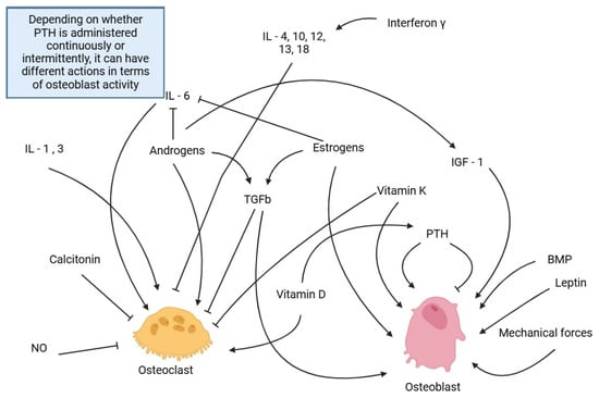 PTH stimulates the activity of osteoclasts to increase Ca2+ levels in the blood in situations of hypocalcemia in a physiological way [45]. However, it has been proven that if administered intermittently, it also stimulates bone formation [43].