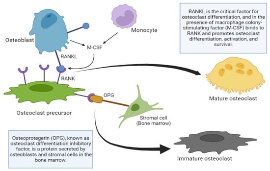 The absence of RANKL in mice also produces osteoporosis, the alteration of the dentition due to the absence of mature osteoclasts, the absence of lymph nodes and the deficiency of B and T lymphocytes. On the other hand, the administration of RANKL in its soluble form produces an increase in the activity of osteoclasts, osteoporosis and hypercalcemia [73]. It can be concluded that the expression of RANKL favors the maturation of osteoclast precursors; the same scenario occurs in OPG knockout mice, triggering the appearance of osteoporosis.
