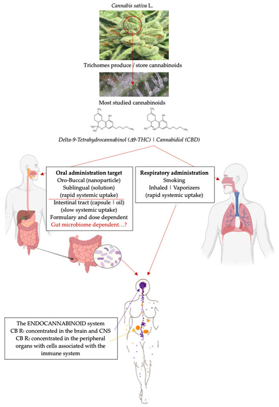 The cannabis plant contains a variety of active phytochemicals, including alkaloids, flavonoids, terpenoids, and the cannabinoids (i.e., the latter referred to as containing greater than 100 molecules that are present in the plant) [19,20]. It is reported that the cannabinoids and the receptors that bind these molecules do have a significant effect on the regulation of intestinal peristalsis and intestinal barrier permeability; as such, the cannabinoid molecules show therapeutic potential [21]. Medicinal cannabis can be administered via different routes that include oro-buccal, sublingual and inhaled or smoked paths that have a fast rate of systemic uptake and the oral–intestinal route that has a much slower rate of systemic uptake (Figure 1).