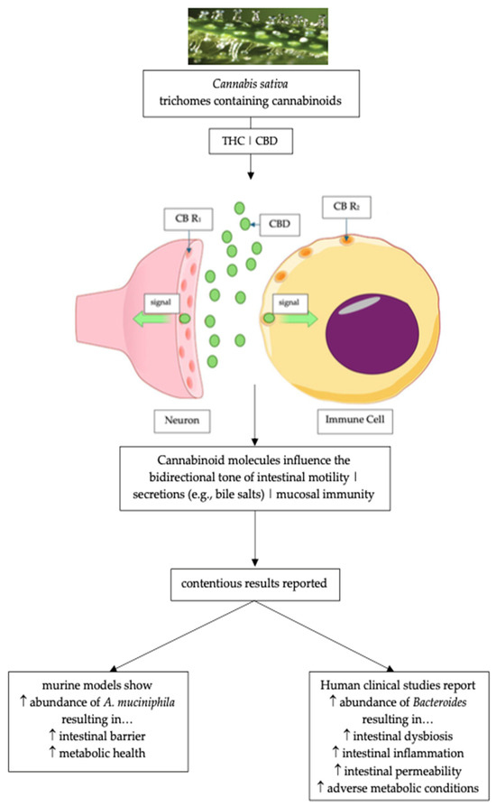 There is a complex bidirectional interaction between the gut microbiome and cannabis molecules. Studies with murine models have reported that when the animals were treated with orally delivered THC, the gut microbiome expressed an increased abundance of A. muciniphila, resulting in improved gut barrier function and improved metabolic health. Human clinical studies have reported that during cannabis use, there was an increase in the abundance of Bacteriodes, resulting in increased gut inflammation and an increase in metabolic disorders [71].